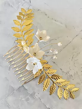 Harmonie – Peigne de mariée doré, fleurs et perles nacrées