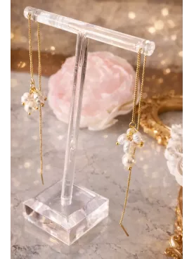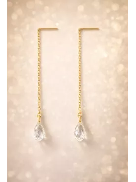 Ces boucles pendantes traversantes sont pensées pour sublimer la mariée avec grâce. La chaîne coulisse directement dans le lobe permettant d’ajuster la longueur selon vos envies, pour un rendu aérien, moderne et épuré. Le cristal, facetté et transparent, apporte une touche de brillance élégante sans jamais alourdir le style.