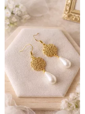 Boucles d’oreilles mariée fleurs & perles d'eau – Doré élégant- Pendantes -Ramo de flores
