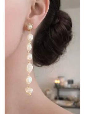 Ces boucles d’oreilles longues sont composées de clous dorés à l’or fin et de perles d’eau douce naturelles aux formes irrégulières.