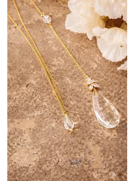 Sa fine chaîne se prolonge en une cascade de cristaux transparents, semblables à des gouttes de lumière glissant le long du dos. Chaque facette capte subtilement la lumière pour créer un éclat raffiné, sans excès.