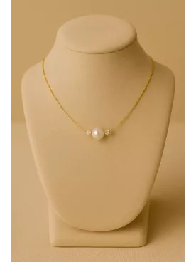 Confectionné à partir d’une fine chaîne en acier inoxydable, il se distingue par trois perles d’eau véritables, légèrement irrégulières, placées en son centre, et par un pendentif délicat orné d’une perle nacrée.