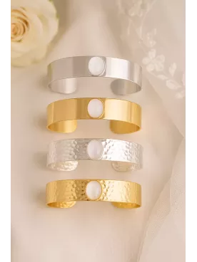 Ses deux cabochons nacrés, disponibles en ivoire ou blanc, captent la lumière avec délicatesse, rappelant l’éclat pur des perles.Fin et harmonieux, il s’adapte parfaitement au poignet pour compléter une tenue de mariée romantique ou bohème chic.