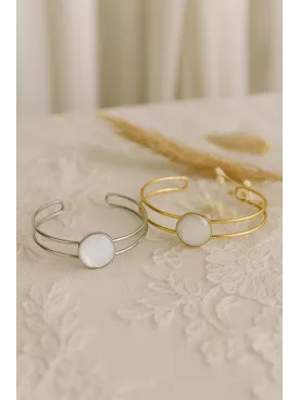 Ce bracelet en laiton doré à l’or fin est orné de deux cabochons ronds en nacre naturelle de 10 mm, une matière précieuse appréciée pour son éclat doux et ses reflets irisés uniques.