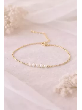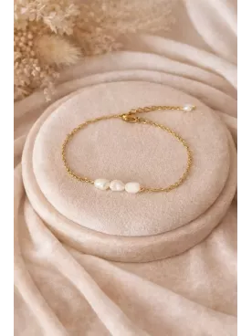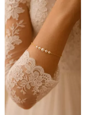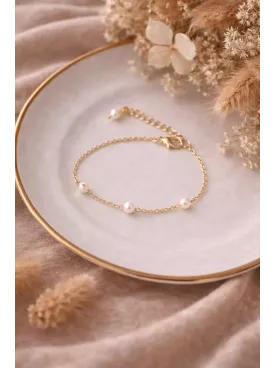 Orné de trois perles délicates sur une chaîne dorée en acier inoxydable , ce bijou mariage illumine le poignet avec subtilité.Minimaliste et raffiné, il accompagne parfaitement une robe de mariée romantique ou moderne.