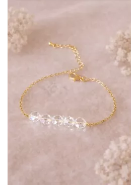 Le bracelet Sourcea se distingue par son élégante composition de cinq perles nacrées Swarovski de tailles dégressives (10 mm, 8 mm et 6 mm), séparées par de fines perles dorées qui soulignent la douceur de ses lignes.