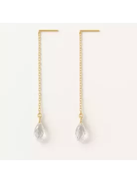 Ces boucles pendantes traversantes sont pensées pour sublimer la mariée avec grâce. La chaîne coulisse directement dans le lobe permettant d’ajuster la longueur selon vos envies, pour un rendu aérien, moderne et épuré. Le cristal, facetté et transparent, apporte une touche de brillance élégante sans jamais alourdir le style.