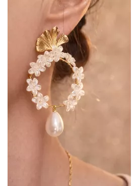 Boucles d’Oreilles de Mariée Fleurs Nacrées & Feuilles Dorées sur Clous en Acier Inoxydable- Floréa