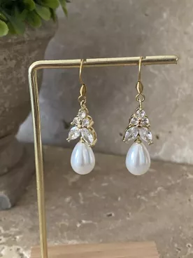• Boucles d’oreilles crochet Cabochon oxyde de zirconium & Goutte Nacrée, Mariage Romantique-Golden Square
